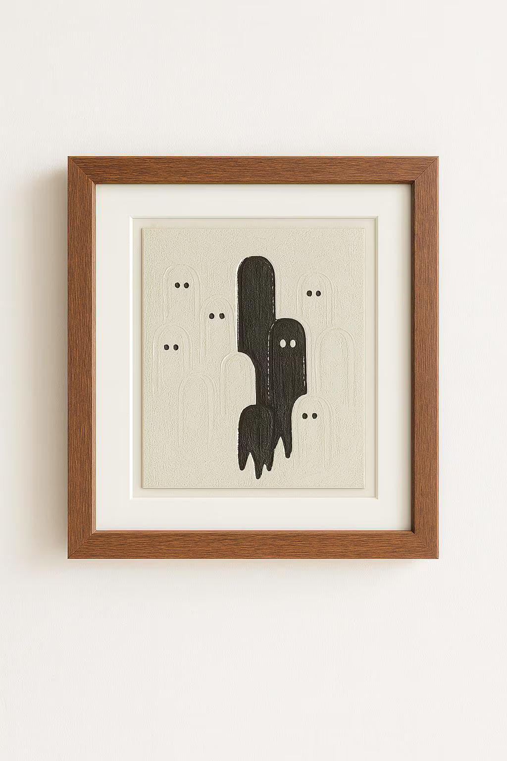 Bring a touch of playful elegance to your home with this minimalist ghost wall art. Featuring a unique textured design of six subtle white ghosts and one bold black ghost, this artwork creates a striking visual contrast while keeping a clean and modern aesthetic.